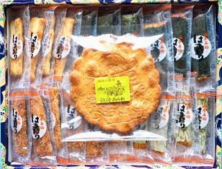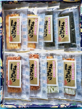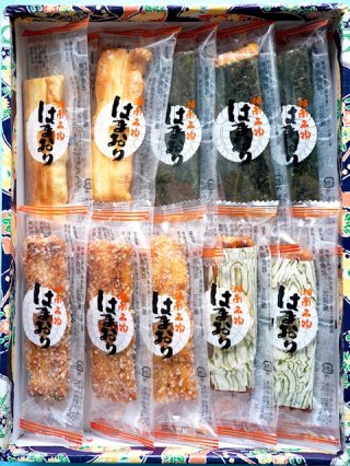 特徴 | 厳選した国産水稲餅米を主原料とし、昔ながらの片火焼きで丁寧に焼き上げたおかきに、国産有機丸大豆で醸造された醤油で味付けをした「はまおり」の10枚入パックです。海苔巻、昆布巻、ザラメの3種類が入っています。 |